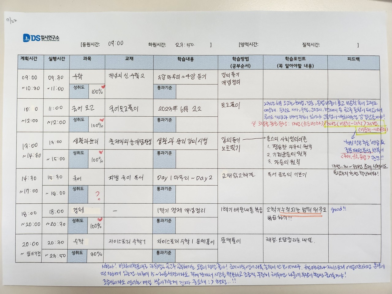 어떤 과목에 시간이 밀렸는지, 어떤 공부가 잘 되었는지를 한눈에 알 수 있습니다.