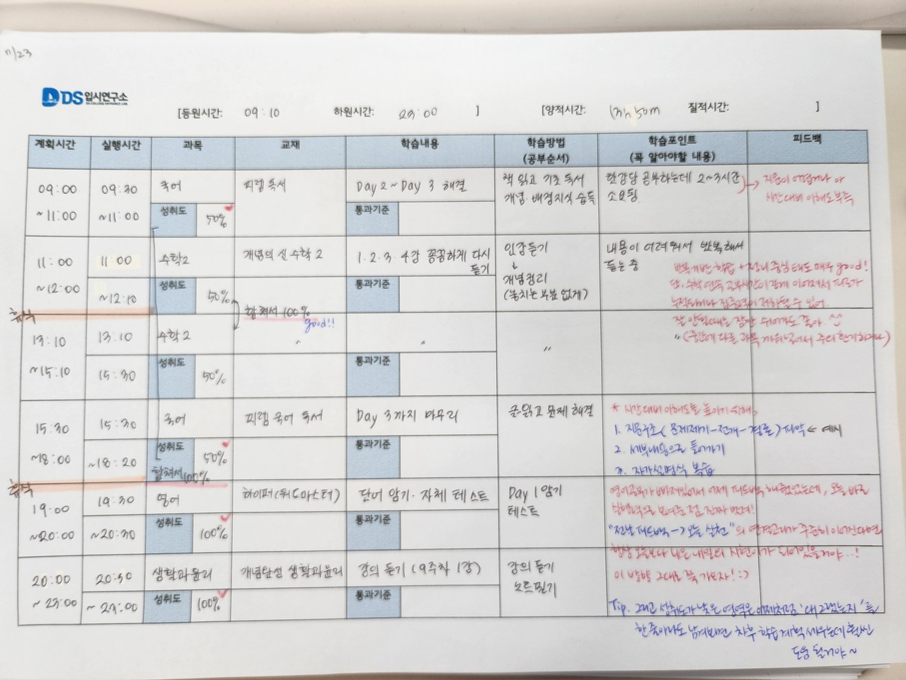 학생과 함께 매일의 학습계획을 세우고, 실천 여부와 학습 태도를 하루 단위로 꼼꼼한 피드백이 진행됩니다.